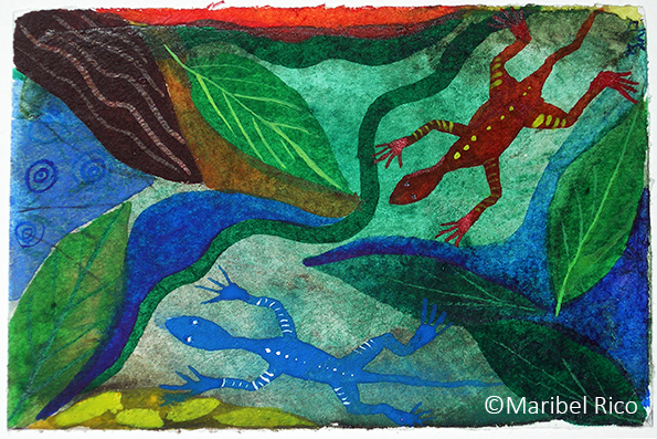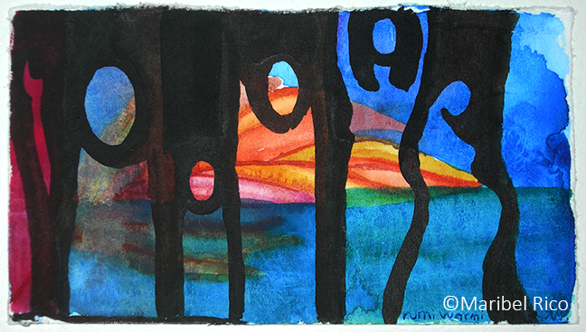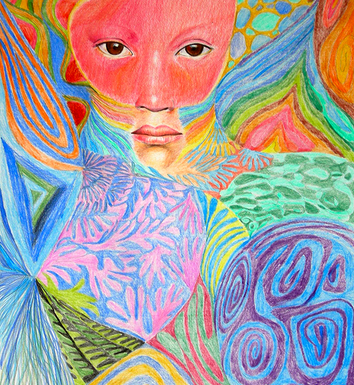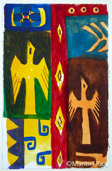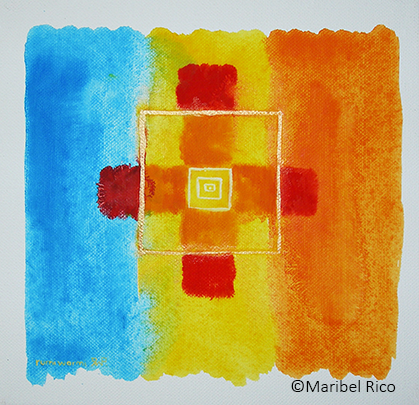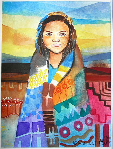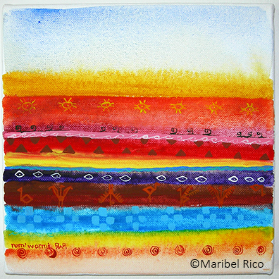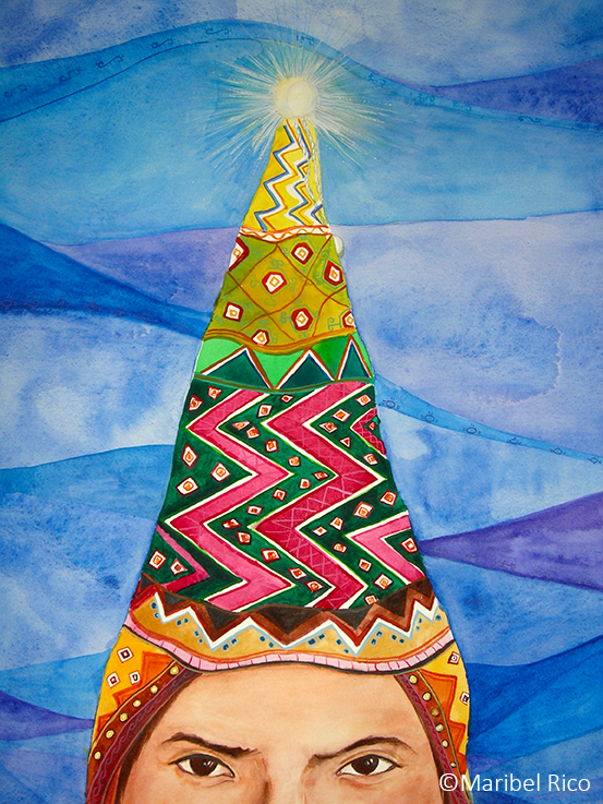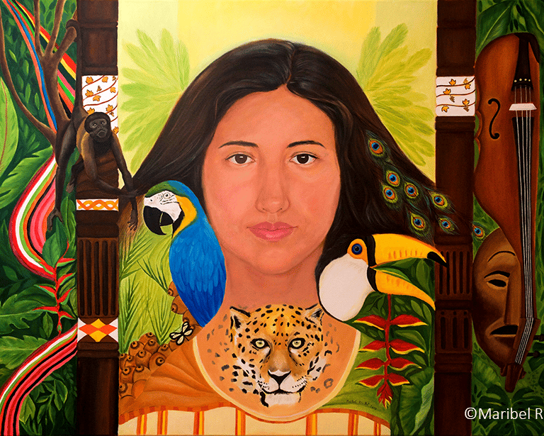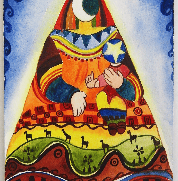 Desde símbolos andinos como las whipalas, chakanas y trenzas presenciamos una composición exquisita de colores expresados por técnicas mixtas, bordados y dibujos que anudan estaciones del ciclo vital de sus personajes.